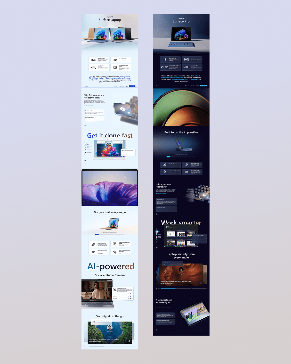 Microsoft introduced Copilot+ PCs as a new category of AI-driven computing—devices designed to be adaptive, context-aware, and deeply integrated into everyday work. The digital experience supporting the launch needed to do more than showcase hardware; it had to communicate a shift in how personal computing works, translating Microsoft’s evolving AI vision into something legible, intuitive, and credible at scale. Working on the launch of the next-generation Surface lineup, I helped shape a modular digital system that balanced clarity with flexibility—one capable of expressing intelligence without overwhelming users. The experience was designed to guide exploration rather than present information flatly, using structure, motion, and responsive storytelling to reveal capabilities progressively and in context. Rather than positioning AI as a feature set, the system framed it as an ambient layer supporting productivity, creativity, and flow. The resulting framework scaled seamlessly across surfaces and touchpoints, providing Microsoft with a future-proof foundation for introducing AI-powered devices. More than a single launch moment, the work established a new model for how Microsoft communicates innovation—grounding advanced technology in clear interaction patterns and a cohesive, durable digital language. - Credits: Jeremy Grant, Design Director Rima Massasati, Design Ken Inoue, Design Ibrahim Noon, Motion Buck, 3D